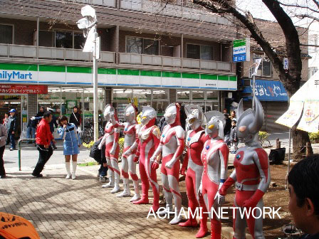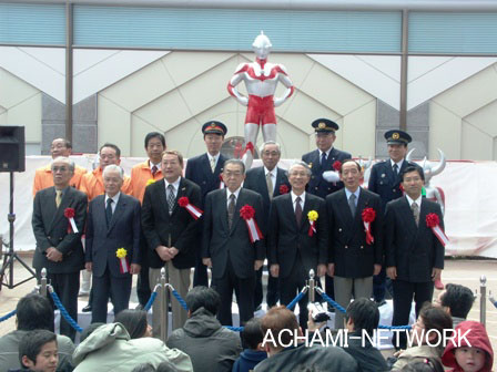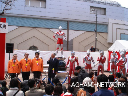 2005年4月3日にウルトラマン商店街が誕生し、その後ウルトラまちづくりの会を中心に「ウルトラマンのシンボル像」の建設計画が進められ、2006年3月19日ウルラマン商店街の中心地である祖師ヶ谷大蔵駅前広場に「ウルトラマンシンボル像」が建設され、各商店街の入口にはウエルカムアーチも建設されました。今後、ウルトラマン商店街を中心に発展して行くことを祈願して、多くの来賓を招待し「ウルトラマンシンボル像完成記念式典」が開催されました。 |